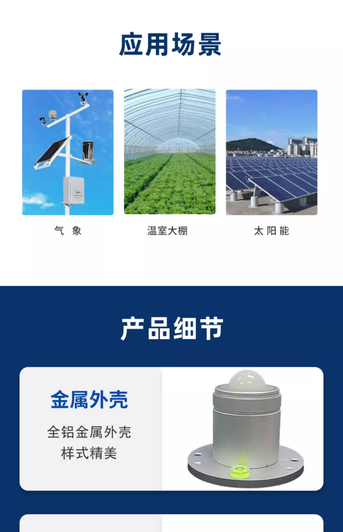 光電傳感器,又稱為光合作用主動輻射傳感器,是一種測量光合有效輻射的儀器,對弱光有較高響應的傳感器。內部纏繞熱電堆,表面涂有高吸收率的黑色涂層。熱接點在傳感面上,冷接點位于體內,產生溫差電勢。在線性范圍內,輸出信號與太陽輻照度成正比。通過濾光片的可見光照射進口光電二極管,轉換成電信號,會進入傳感器的處理器系統,從而輸出所需的信號。