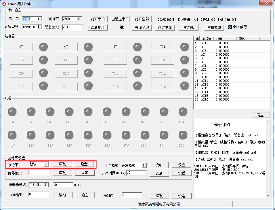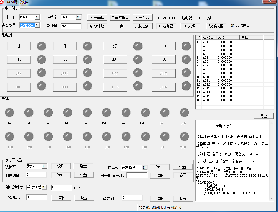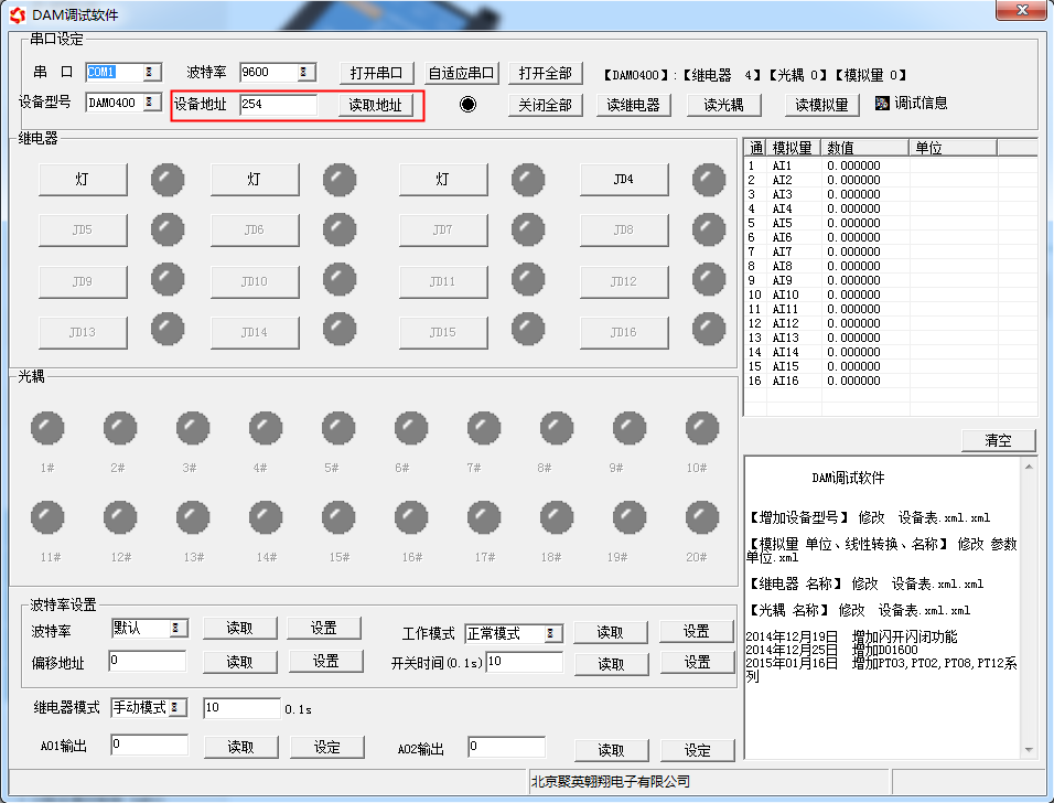打開“聚英翱翔DAM調試軟件”;串口設定欄:串口選擇您電腦對應COM口,波特率選擇設備默認波特率(9600)(未自己設置過波特率前),設備地址填寫“254”(254為設備的廣播地址),設備型號選擇相對應型號,設置好以上設備的4個參數后點擊打開串口,點擊繼電器按鈕“JD1”若繼電器反應則連接成功。
