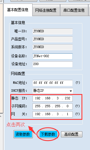 在“基本配置信息”欄內(nèi),修改設(shè)備IP為靜態(tài)IP,與電腦所處網(wǎng)段為同一網(wǎng)段,點(diǎn)擊“下載參數(shù)”,2S后再點(diǎn)擊“下載參數(shù)”,提示配置成功。