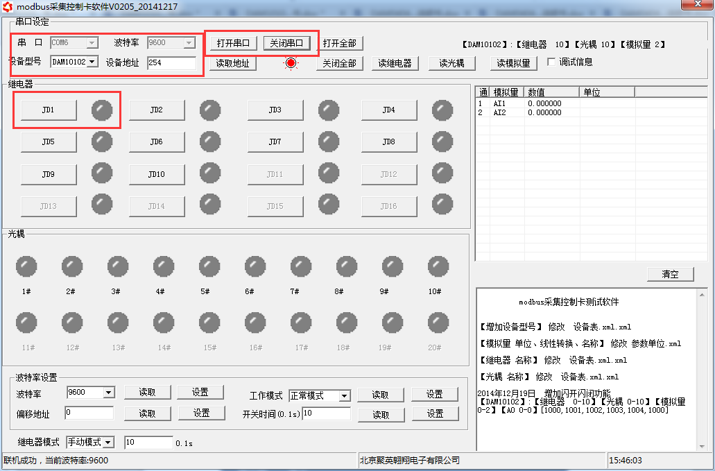 打開(kāi)“聚英翱翔DAM調(diào)試軟件”;串口設(shè)定欄:串口選擇您電腦對(duì)應(yīng)COM口,波特率選擇設(shè)備默認(rèn)波特率(9600)(未自己設(shè)置過(guò)波特率前),設(shè)備地址填寫(xiě)“254”(254為設(shè)備的廣播地址),設(shè)備型號(hào)選擇相對(duì)應(yīng)型號(hào),設(shè)置好以上設(shè)備的4個(gè)參數(shù)后點(diǎn)擊打開(kāi)串口,點(diǎn)擊繼電器按鈕“JD1”若繼電器反應(yīng)則連接成功。