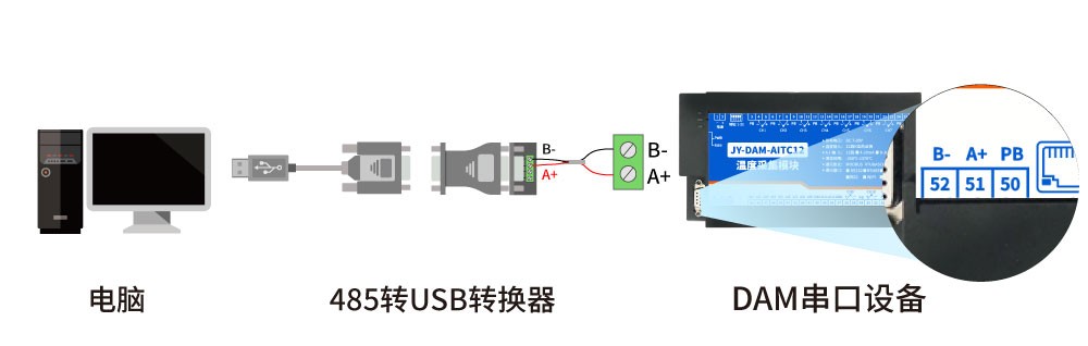 電腦自帶的串口一般是RS232,需要配232-485轉換器(工業環境建議使用有源帶隔離的轉換器),轉換后RS485為A、B兩線,A接板上A端子,B接板上B端子,485屏蔽可以接PB。若設備比較多建議采用雙絞屏蔽線,采用鏈型網絡結構。