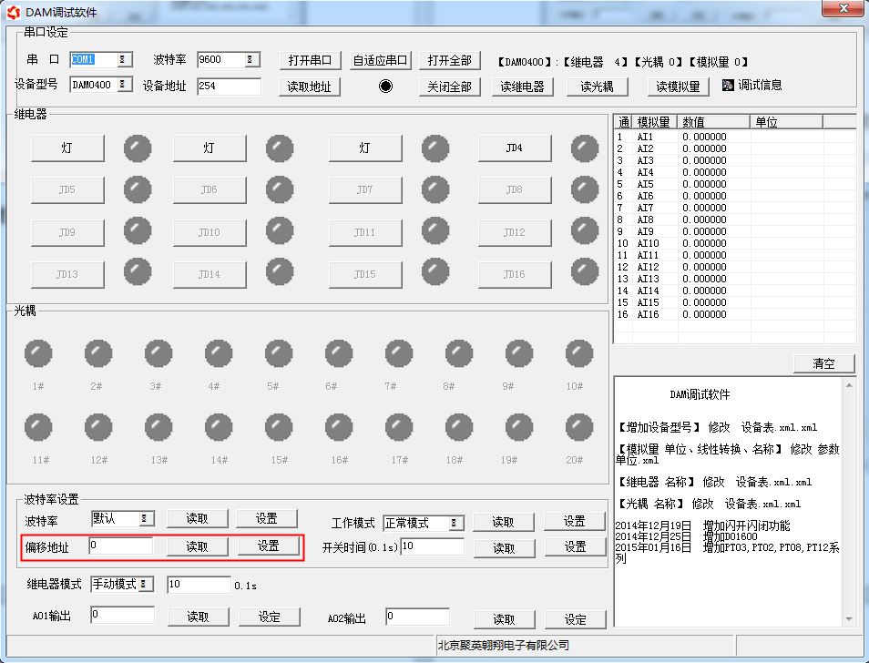打開“聚英翱翔DAM調試軟件”;串口設定欄:串口選擇您電腦對應COM口,波特率選擇設備默認波特率(9600)(未自己設置過波特率前),設備地址填寫“254”(254為設備的廣播地址),設備型號選擇相對應型號,設置好以上設備的4個參數后點擊打開串口,點擊繼電器按鈕“JD1”若繼電器反應則連接成功。