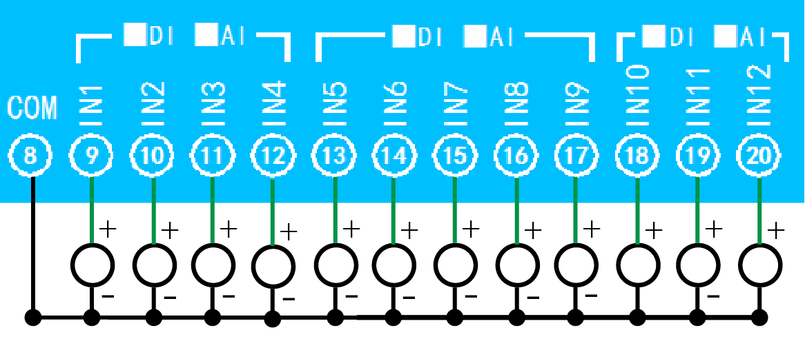 下圖中的ACOM為設備上的供電負極,AINn為設備上的IN輸入