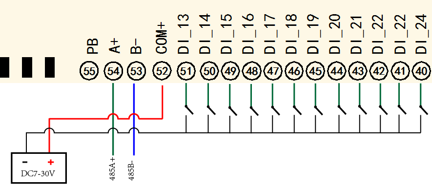 電腦自帶的串口一般是RS232,需要配232-485轉換器(工業(yè)環(huán)境建議使用有源帶隔離的轉換器),轉換后RS485為A、B兩線,A接板上A端子,B接板上B端子,485屏蔽可以接GND。若設備比較多建議采用雙絞屏蔽線,采用鏈型網絡結構。